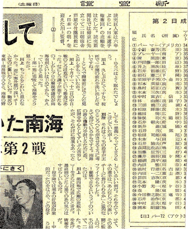 上の切り抜き記事裏面 プロ野球で日本シリーズを制した読売巨人軍の川上監督へのインタビュー記事 インタビュー記事の右側にはゴルフの成績順位記事があり、1位にはアーノルドパーマーの名前が見える ![]() |